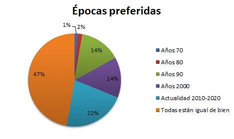 Una paradoja relativamente interesante nace de la pregunta de «qué época/década del anime consideras mejor». La mayoría de los participantes, un 47%, votaron que todas ellas están igual de bien. Pese a tal aseveración, sólo un 11% de los animes mencionados entre los favoritos fueron emitidos o finalizaron antes del año 2006. Esto podría explicarse desde la perspectiva de que la digitalización y mayor comercialización internacional tras inicios de los 2000 multiplicaron el número de producciones por temporada, lo cual hace mucho más factible que alguien encuentre su obra favorita a partir de esa época, al aumentar el grueso total de forma tan evidente.
