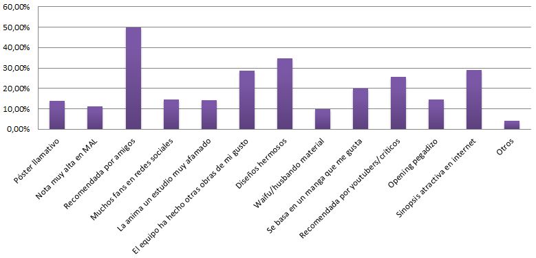 Sorprendentemente o no, el público continúa teniendo en mayor estima las recomendaciones de personas cercanas respecto a las de youtubers o críticos profesionales, como se extrae de la siguiente gráfica, que trata las opciones que llevan a la gente a ver o no un anime.