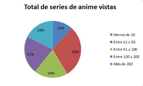 La primera parte de la encuesta pretendía observar la relación de consumo temporal y temático al respecto de la población, así como las costumbres habituales a la hora de llevar a cabo ese mismo consumo. Como se puede apreciar en las figuras adjuntas, un 37%, la mayoría de los encuestados, visionan entre uno y tres capítulos a la semana, seguidos por el 30%, que hacen lo propio con entre cuatro y ocho episodios. Asimismo, en cuanto al total de animes vistos, la opción más popular fue entre 21 y 50, seguida del segmento comprendido por 100 y 200. Sólo un 12% se quedaron en la veintena de animes o menos. Por lo tanto, si alguien entra en el mundillo, pronto aumenta sus números.