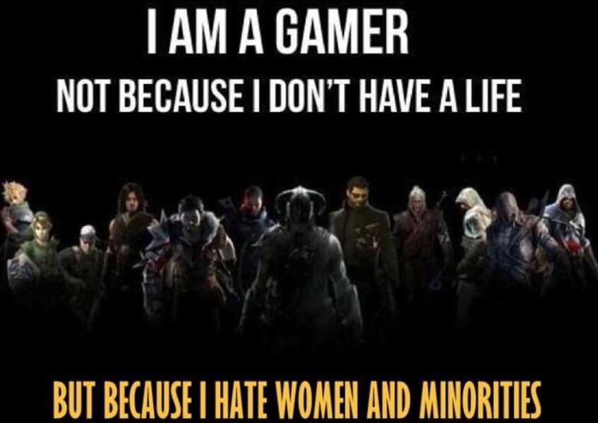 Sin duda, lo primero que se nos viene a la mente cuando juntamos las palabras «gamer» y «tóxico» es el odio a mujeres y minorías. Os suena, ¿verdad? Hay hasta un famoso meme que describe perfectamente esto, y que dejo bajo estas líneas, que dice: «Soy gamer no porque no tenga vida, sino porque odio a las mujeres y las minorías». Y este meme no podría ser más acertado; es cierto que este odio muchas veces no se manifiesta de forma directa hacia personas reales, pero sí por ejemplo a través del vilipendio que sufre de forma sistemática casi cualquier personaje protagonista femenino que no esté sexualizado o el rechazo que muestran los gamers ante la introducción de personajes racializados o LGTB+ en los videojuegos, muchas veces alegando falta de realismo histórico («no había mujeres importantes en este periodo histórico, ni gente racializada, ni personas LGTB+»), pero curiosamente nunca les parece que la inclusión de criaturas fantásticas sea falta de rigor histórico, ¡qué casualidad! Todo les parece diversidad forzada, incluido el hecho de que haya mujeres protagonistas que no estén hechas para, dicho directamente, que ellos se hagan pajas. Aloy es fea, Selene (protagonista de Returnal) es fea, Abby de The Last of Us 2 no parece una mujer porque es musculosa… Hay miles de ejemplos, seguro que a vosotros se os ocurrirán muchos más de los que yo aporto.