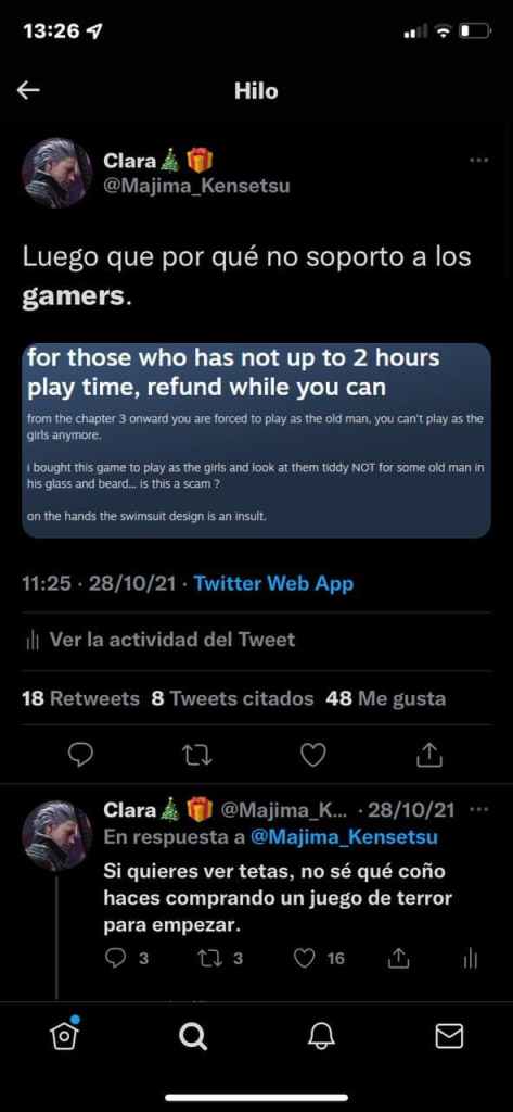Sobre el tema de hipersexualización y hacerse pajas, estuve envuelta en una polémica relacionada con esto hace unos meses en Twitter. Y es que yo tomé una captura de un comentario de los foros de Steam en el que un gamer lloraba porque en Project Zero: Maiden of Black Water hay partes en las que hay que jugar con el protagonista masculino, Ren Hojo, y se quejaba porque él solo quería jugar con las chicas. Yo dije que me parecía patético (porque lo es) comprarse un juego de terror por las pajas, y menuda me cayó. Se pasaron varios días citándome varios tweets que ya ni siquiera tenían que ver con el tema desde cuentas candado, ante lo que yo no podía hacer nada porque no las podía bloquear.