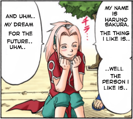 Sakura supuestamente está enamorada de Sasuke desde el principio. Pero más que enamorada lo que le pasa es que se siente atraída hacia él porque es guapo —y porque según Kakashi las chicas de su edad lo único que hacen es pensar en chicos—, de la misma manera que se Naruto se siente atraído hacía Sakura. Apenas se conocen y realmente no se aguantan entre ellos pero estos dos ya han decidido con quién quieren casarse guiándose por las apariencias. Pero bueno, son jóvenes y tienen muchas cosas que aprender así que en parte es entendible. A medida que vayan creciendo deberían darse cuenta de lo que les conviene… ¿o no?