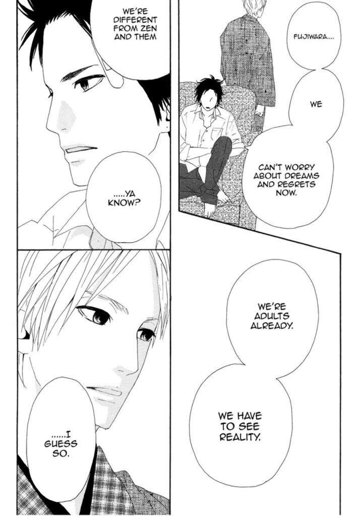 También es cierto que, leyendo el manga, veremos que no es la edad el mayor impedimento para estos personajes. La vida adulta trajo consigo circunstancias, impedimentos y problemas más «reales» que no les permitían seguir soñando, y con ello tienen que enfrentarse a vicisitudes del día a día: expectaciones familiares, pagar facturas y un sistema social y económico que no va admitir que se atrevan a soñar despiertos.