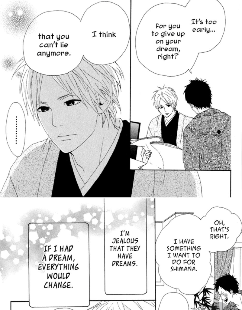 Los sueños son el leitmotiv, junto con la idea de enamorarse, de este manga. Conocemos los sueños que tienen Shimana —enamorarse—, Zen —publicar su manga— y Asahi —estudiar derecho—, adolescentes que se pueden permitir soñar despiertos y tienen todo el tiempo que quieran para luchar por sus sueños. Sin embargo, pronto veremos que los personajes más adultos, como Taiga o Ken —el hermano de Zen—, también tienen sendos deseos que quieren cumplir, aunque ya hayan llegado a la edad adulta.