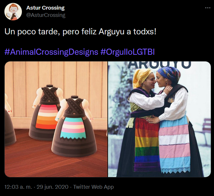 Es defendible que todos los videojuegos tienen su dimensión humana en este sentido, y buenas amistades se han iniciado echando unas partidas a los Fifa o los Mario Kart, o se han destruido cuando lanzas un caparazón azul. Pero creo que el caso de Animal Crossing es especial por el enfoque que ese juego otorga a elementos que refuerzan la creatividad colectiva como, por ejemplo, la facilidad con la que accedemos al portal de diseños personalizados y conocemos a artistas que idean ropa, complementos y otros accesorios con los que personalizar a nuestro personaje. Es en valores humanos como la creatividad donde videojuegos como éste se convierten en obras notables que hacen partícipes a todo el mundo. Como observación complementaria personal, mucha gente conoció la campaña iniciada por plataformas políticas como Podemos Asturies del Arguyu (Orgullo LGTB+ asturiano) gracias a los diseños de Sarape, con su proyecto en Twitter de Astur Crossing.