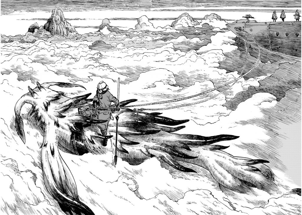 Todo esto conecta con Drifting Dragons de manera importante, sobre todo con el uso del aceite. Ya que el mundo de este manga es uno con tintes y estética muy industrializado, el aceite de dragón es lo que hace que los engranajes del propio mundo se muevan. Esto es un paralelismo con el propio aceite de ballena en el siglo XIX, que desapareció casi del todo a finales del mismo, y fue sustituido en sus últimos usos en 1986 por el aceite de jojoba. Se asienta así esta relación entre realidad y ficción en lo tocante a la caza y extracción de materia de seres en peligro de desaparición.