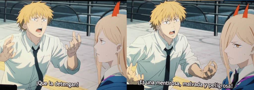 Tampoco se puede tachar de inapropiado todo lo propio. En el segundo episodio de Chainsaw Man, encontramos un diálogo —también bastante comentado en Twitter, pero sin llegar a las magnitudes del otro caso— que cumple con todas las expectativas de una traducción competente, en la que se deja reflejado el humor de la serie de una forma muy española. Denji en esta ocasión sigue conservando su identidad japonesa intacta; los subtítulos nos dejan leer las palabras que nosotros, hablantes de español, identificamos con un macarra sin respeto, porque es lo que el idioma y la forma de hablar nos transmite. Las palabras de Denji son orgánicas y creíbles, pues las puede pronunciar tanto un gamberro japonés como el gamberro del pueblo. Obviamente, existen muchísimas variables que condicionan a los traductores al momento de aplicar estas jergas o expresiones: ¿En qué época está ambientada la acción? ¿Qué sociolecto corresponde a cada personaje? ¿Este personaje debe hablar de usted o puede mostrarse más cercano? ¿La forma de hablar corresponde con su edad, o el autor deliberadamente le atribuye otra en el original? ¿Trata a todas las personas igual o cuando mantiene una conversación con otro personaje en específico se vuelve educado? ¿Las expresiones que usa tienen alguna relevancia para la trama?