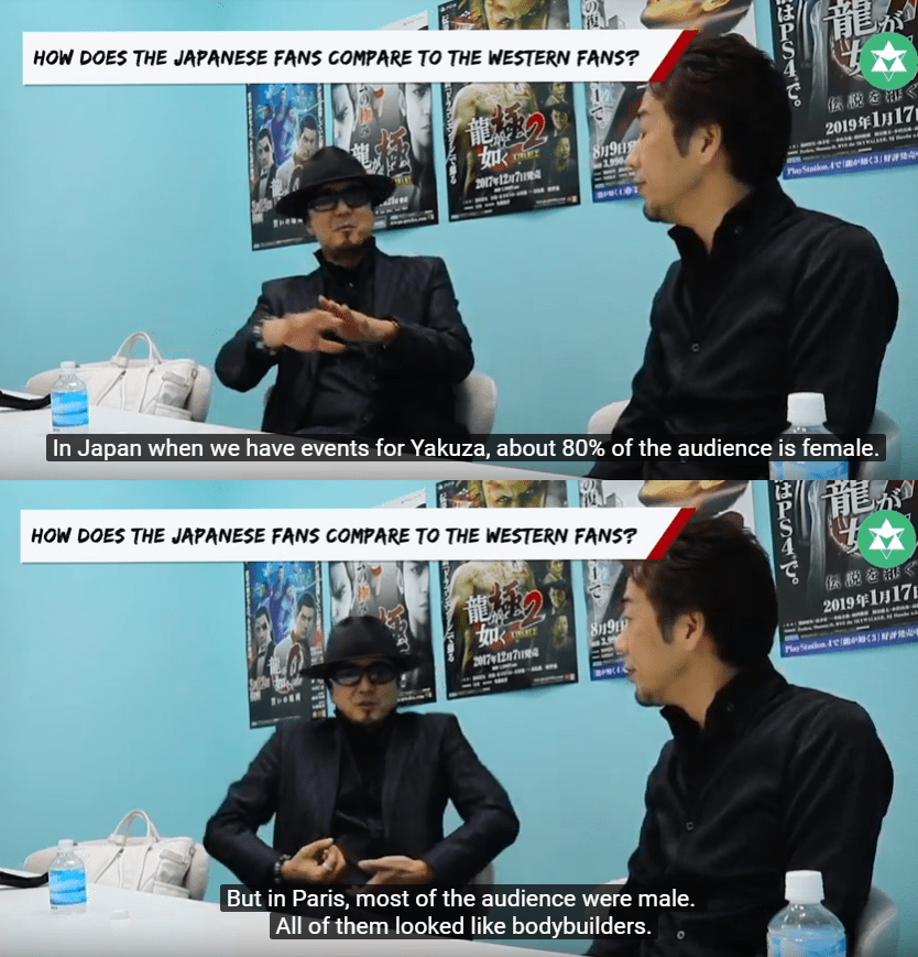 Toshihiro Nagoshi, el creador de la saga, comentó en una entrevista de 2019 sobre sus expectativas originales para la saga y luego el desarrollo que tuvo. Habla de cómo en primera instancia pensó dirigir la saga a un público masculino adulto y mayormente dentro de Japón. Esta demografía resultó, para sorpresa de los desarrolladores, pero no de cualquier otra persona una vez que echas un vistazo más detallado, no ser la única que se veía atraída a la saga. No podemos percibir esto solo en los espacios para fanes de la saga, sino que Takaya Kuroda, el seiyuu de Kiryu, comentó en una entrevista sobre las diferencias entre los asistentes a los eventos de la saga en Japón y en Francia. Mientras que en Francia comenta que se encontró prácticamente una legión de culturistas, en Japón el público que asiste a estas conferencias suele ser en su mayoría femenino. Desde luego, es un contraste entre las jugadoras y los elementos de los propios juegos.