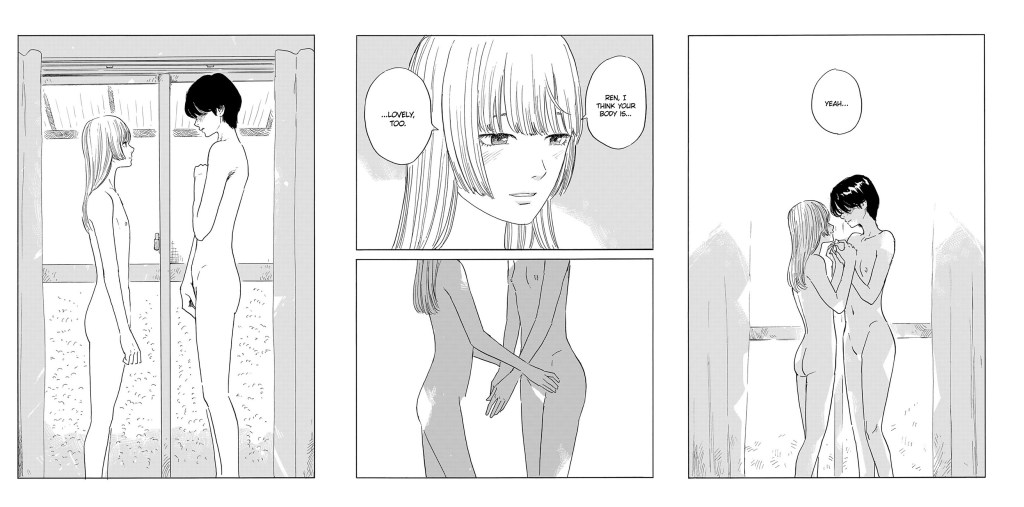 Una de las más claras muestras de que esta obra se preocupa y entiende la realidad LGBT se encuentra en Ren. Ren aparentemente es una mujer, pero se fascina en cuanto conoce a Kei, su historia, y su forma de ver el mundo. Le revela cómo siempre ha tenido problemas para identificarse en su genero asignado, pues es mas alta de lo que debería y más fuerte de lo que se esperaría, pero luego llora y es más sensible que cualquier hombre. Kei, que se encuentra en unas circunstancias en las que duda de su decisión,—pues a pesar de estar feliz, le ha traído problemas que jamás se habría imaginado—, le recibe entre sus brazos, y en un momento concreto de la obra, comparten una de las escenas más bonitas que he visto en mucho tiempo en el medio del manga: ambos personajes se desnudan, contemplan su cuerpo sin ningún pudor y se muestran simpatía. Siempre se cuestiona que en la ficción veamos a personajes LGBT sólo relacionándose entre ellos, pareciendo que estos no puedan acercarse a personas distintas a sus preferencias o forma de definirse. Esta escena nos demuestra por qué pasa esto, pues Ren es la única persona de su círculo que en este momento puede comprender del todo por lo que está pasando, aunque sus experiencias no sean iguales a las de Kei. Ambos entienden lo complicado que es para el otro tener ajustarse a unas normas que no funcionan. La solidaridad entre miembros del LGBT se da por esto precisamente, porque nadie que no forme parte puede llegar a entender lo complicado que es a tantos niveles, y el cómo Oshimi decide mostrarlo es simplemente precioso.