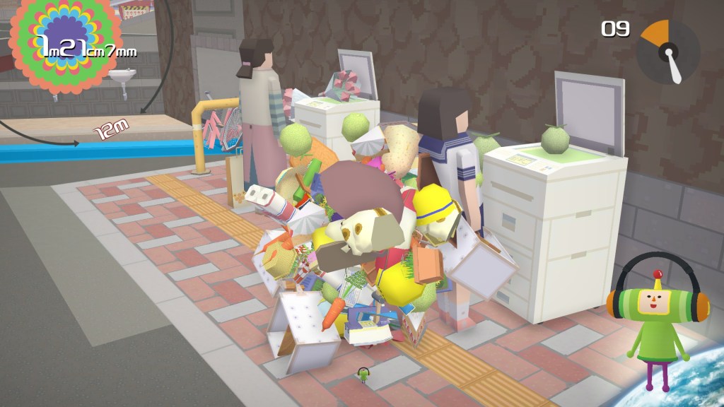 Y así es, en 2004 salió para la PlayStation 2 este juego de Namco diseñado y dirigido por Keita Takahashi y remasterizado años más tarde por la fusionada Bandai Namco, en 2018, con el subtítulo Katamari Damacy: Reroll con lo que llegó a plataformas más actuales. Si el inicio del artículo no ha despertado una idea de la jugabilidad del juego, un resumen simple sería: Tu padre, el rey de todo el cosmos, se ha deshecho sin querer de las estrellas y es tu trabajo como príncipe rehacerlas con la ayuda de arrollar todo a tu paso con las pelotas adhesivas de distintos tamaños que dan nombre al juego, los Katamaris. Esta es la premisa con la que el juego te invita a pasearte por tus niveles pegando todo lo posible a la bola antes de que el límite de tiempo llegue a cero.