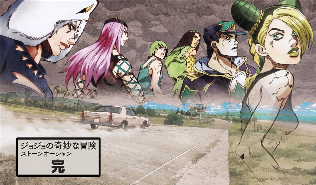El otro aspecto que hace de Stone Ocean una serie rompedora es que es una de las pocas veces que el villano se sale con la suya —más o menos, matizaremos esto posteriormente—. Esta saga de Jojo siempre ha dado de qué hablar, y quien haya leído el manga lo sabe, precisamente porque supone el final de todo el universo que Araki se esforzó en crear durante casi dos décadas. Para cuando acaba Stone Ocean y el universo se resetea, es imposible no haber cogido cariño a más de un personaje de la historia familiar de los Joestar-Kujo, y David Production ha hecho un trabajo excelente con el último capítulo introduciendo el ya mítico y célebre ending de Yes, Roundabout, que nuestros lectores recordarán que fue la canción que ponía punto final a los capítulos del anime de Phantom Blood y Battle Tendency, las dos sagas que dan origen a la historia de los Joestar. El último ending es un guiño a toda la serie, pero también a los fans incondicionales, y es que —además de la canción, que casi te hace saltar de la silla con esos tan reconocibles acordes de guitarra— las imágenes son un repaso a toda la serie y sus protagonistas, desde Phantom Blood hasta la propia Stone Ocean. Si eres mínimamente fan de Jojo, resulta casi imposible no soltar una lagrimilla.