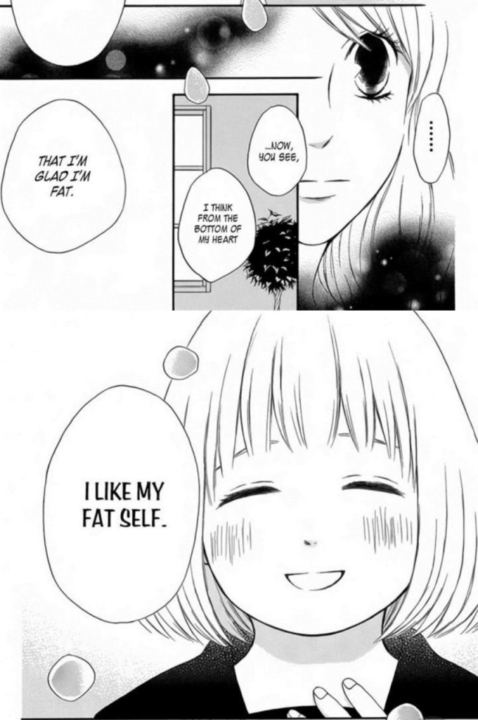 Sí es cierto que hay algo constante en el manga —aunque solo es un comentario por encima— donde dicen que Tagami es un «desperdicio de chico guapo» por enamorarse de una chica gorda en vez de una chica cuyo cuerpo sí es aceptado socialmente. El manga trata estupendamente todas las preocupaciones que deriva este tipo de relación, donde uno de los integrantes de la pareja sí tiene cuerpo normativo y la otra persona no, y todas las inseguridades que esto puede provocar —y más especialmente tratándose de adolescentes—. Es un gustazo ver cómo este manga trata tan bien problemas reales y lo hace con tacto, aunque manteniéndose constantemente fiel a la realidad que puede —y vive— una persona gorda. Desde sentir que su pareja no debería estar con ella hasta proponerse adelgazar como sea y ayunar, entre otras.