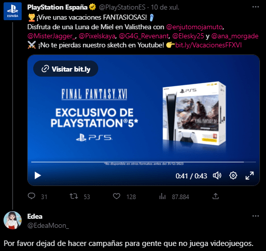 Hace unas semanas, la cuenta oficial de Twitter de PlayStation en España sacó un anuncio en formato de vídeo, en el cual varias celebridades de internet se juntaban en un spot publicitario del nuevo Final Fantasy XVI, simulando ser una agencia de viajes y promocionando el mundo como un destino vacacional en un fuerte tono humorístico. Nadie de nuestra redacción forma parte del equipo de marketing de PlayStation España, pero es legítimo suponer que querían proponer algo poco habitual, como el bombazo que fue el video publicitario de God of War. En aquel se nos presentaba a Kratos como un padre primerizo —y cumpliendo con algunos clichés que podrían resultar incluso casposos—.