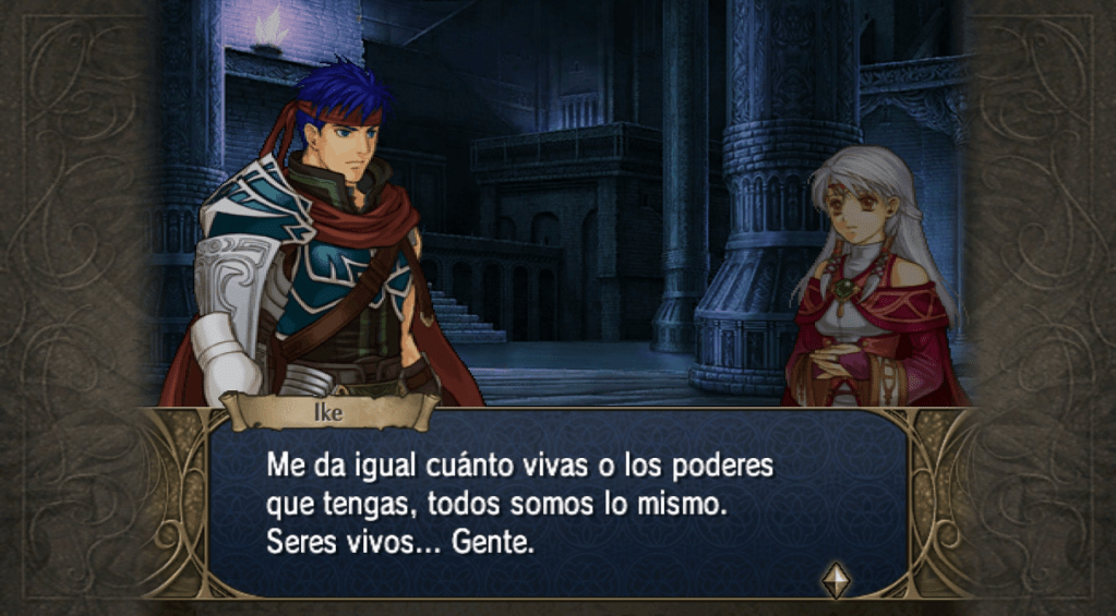 En lo tocante a personajes y guion, la estructura desdoblada aquí no es problemática y de hecho, acrece el sortilegio en la pluma de una Intelligent Systems a la que no se le agotaba el jugo ―una noción que, como veremos más adelante, no se predica en entregas más recientes de la saga―. A pesar de que manejamos un elenco enorme, nunca se sacrifica la profundidad que cada sujeto es susceptible de aportar como piezas en el enorme puzle que es Tellius como ambientación. Los protagonistas en particular operan como catalizadores de las temáticas centrales del título. Elincia y Sanaki comparten la herencia y el peso de las expectativas como pieza clave, de nobles intenciones pero temerosas a la hora de asumir riesgos y sentenciar sobre el futuro de sus países. A través de Micaiah y su enternecedora relación con Sothe, aprendemos sobre lo reñido que está el camino de la aceptación si queremos mostrarnos tal y como somos ante el prójimo. Por su parte, la sola presencia de Ike ―quien podemos asumir que le ha dado a las proteínas en el tiempo entre entregas― es tremendamente satisfactoria: lo vemos como un personaje consolidado, frustrado y decidido a actuar ante las injusticias del mundo que lo rodea. Sigue siendo el chaval tosco con el que nos encariñamos, pero ahora goza de sensibilidades dignas de una admiración distante, comparable a ese icónico momento de Pokémon Oro y Plata donde se nos quitó el hipo al enfrentarnos a Rojo en la cumbre del Monte Plateado.