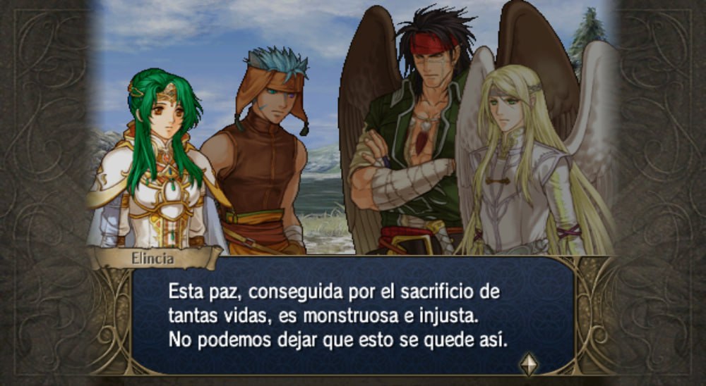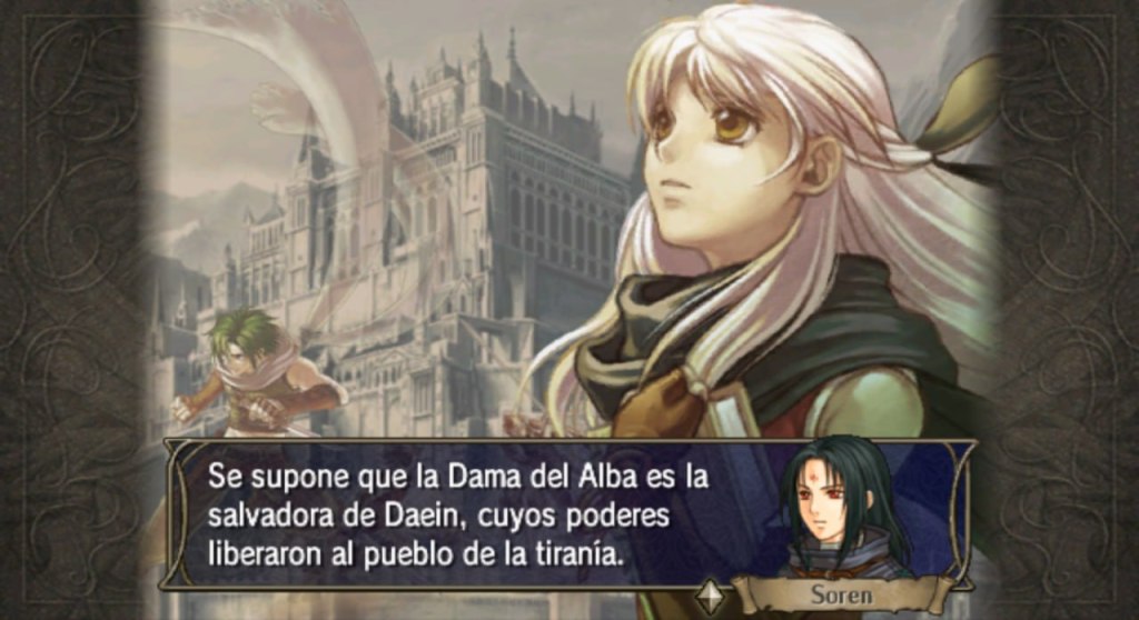 Y es que Radiant Dawn no se anda con rodeos en lo que respecta a narrativa. Desde el preciso instante en el levantamos el telón queda marcado el tono subversivo de la obra: nos encontramos en las calles de Nevassa, capital de Daein. Sí, esa Daein: los «malos» del juego anterior. Encarnamos el papel de la Brigada del Alba, un grupo de jóvenes justicieros que reclaman la independencia del país tras la guerra, liderado por el dúo de Sothe ―el cual aparecía como cameo glorificado en el juego anterior― y una chica de cabellos blancos llamada Micaiah. En efecto, la nación hegemónica de Begnion controla con mano de hierro este territorio desde hace tres años, poblado por un campesinado desprotegido que no tenía la culpa de los crímenes que cometió su anterior monarca. Una vez despachamos a los bandidos de turno, observamos cómo el ejército está buscando a nuestros improbables héroes para subyugar toda resistencia y consolidar el dominio militar. Pero hay luz al final del túnel: se rumorea que, más allá del desierto, vaga un heredero de Ashnard. No solo eso, sino que al parecer está reuniendo aliados. Así, con el eventual apoyo de los Lobos de Hataree ―un clan laguz que se creía perdido, aislado del resto del continente―, Micaiah y los demás se embarcan en una aventura para recuperar la soberanía de su hogar.