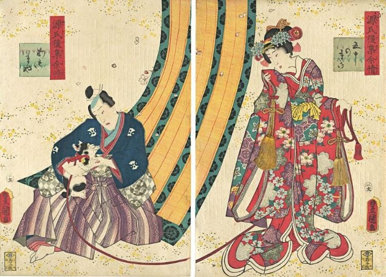 Se ha hablado del Genji Monogatari en otros artículos de la página web ―y también del mono no aware aplicado a alguna que otra obra―, pero, a modo de breve resumen, Genji Monogatari es una novela escrita en la era Heian por Murasaki Shikibu, una noble que trabajaba en la corte de la época como dama de compañía. La historia trata sobre la vida y los amoríos de Genji, un hijo ilegítimo del emperador, que destaca dentro de la corte por su belleza y personalidad, aunque en capítulos posteriores los protagonistas pasan a ser su hijo Kaoru y su nieto Niou. A lo largo de la obra podemos ver numerosos ejemplos de los personajes conmoviéndose ante diversos sucesos o fenómenos, con los cuales se entiende la idea de mono no aware. Por ejemplo, hay una escena donde Genji va a un templo y, por el camino, se dice lo siguiente sobre el paisaje: