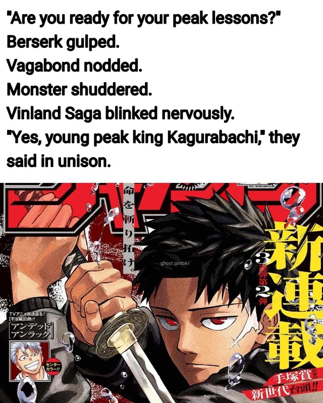 Esta es la sinopsis que se puede leer en Manga Plus de Kagurabachi, la nueva obra de Takeru Hokazono, que empezó a publicarse hace algo más de dos meses. Desde el primer día que se anunció, con esta sinopsis tan de manga de acción genérico, Internet entero no tardó en llenarse de memes bromeando sobre que teníamos ante nuestros ojos al mejor manga que de este siglo, que iba a ser “peak fiction”.