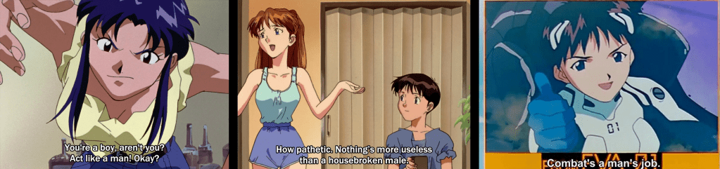 Esto es lo que Shinji escucha repetidas veces a lo largo de la serie, de boca de personajes como Misato y Asuka ―ambas teniendo problemas en su percepción y relación con la feminidad, pero eso podemos tratarlo en otro artículo―. Se le dice de forma despectiva que es un hombre, que dependiendo de ciertas situaciones debe tener sangre en las venas y reaccionar. Si Shinji no está reaccionando como un perro en celo cuando se le presenta la oportunidad, no es lo suficientemente hombre; si Shinji no es valiente ante una situación de gran peligro y demuestra temor, no es lo suficientemente hombre; si es «blandito» y está «domesticado», no es lo suficientemente hombre y si Shinji no demuestra fortaleza y confianza, no es lo suficientemente hombre.