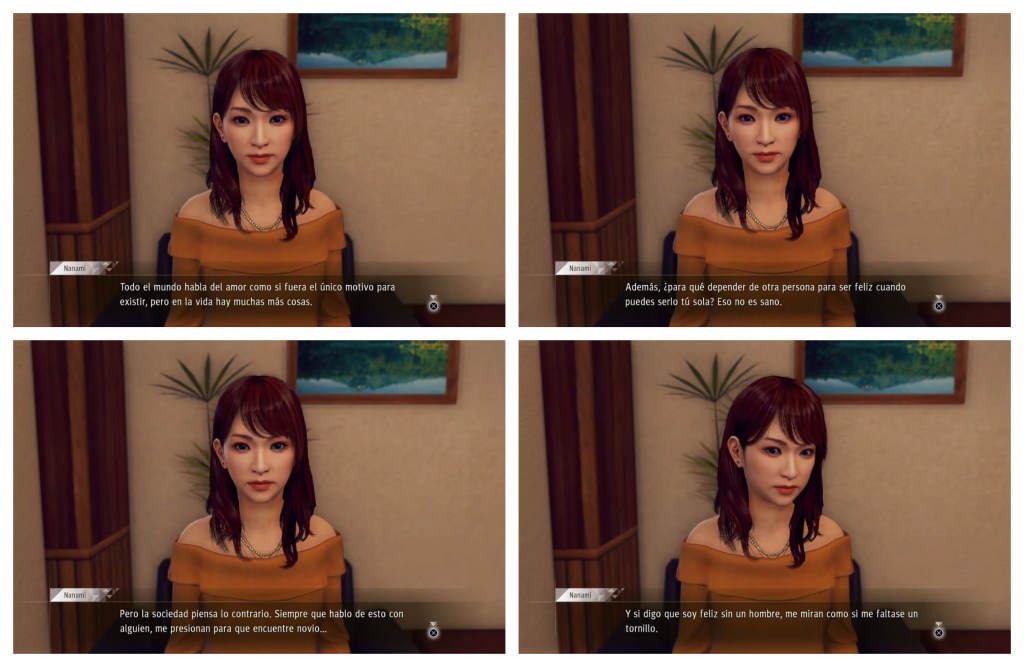 Además, no es el primer caso donde RGG Studio nos muestra un personaje femenino de este tipo. En Judgement, un juego que lanzaron en 2018, hay cuatro chicas que pueden ser la novia del protagonista, Takayuki Yagami. Una de ellas, Nanami Matsuoka, se nos presenta como una mujer que está muy centrada en su trabajo. En una de las citas que podemos tener con ella dice lo siguiente: