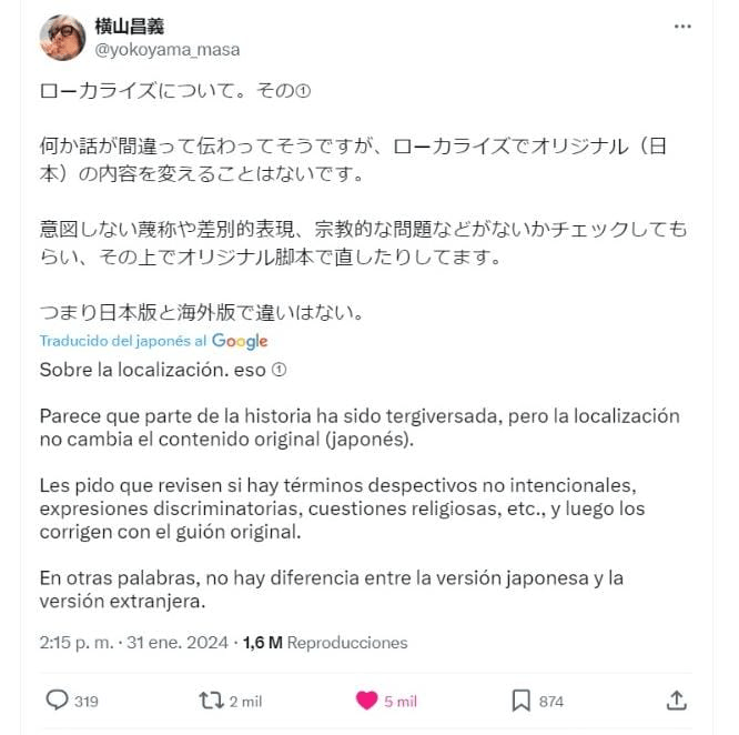 Como he mencionado antes, la polémica con la escena de Nanba hablando sobre Saeko junto con otros casos que fueron saliendo, obligaron a Yokoyama a hacer unas declaraciones respecto al tema de la localización. El problema viene que muches internautas entendieron que Yokoyama habría consultado con traductores y localizadores y que fueron éstes quienes tuvieron la última palabra sobre lo que ponía o no el desarrollador japonés en el guion final. Por tanto, vamos a hablar del primer tuit de Yokoyama respecto al tema, que es el que ha causado más reacción entre los usuarios de la red social, el cual es el siguiente: