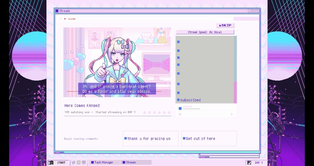 Una cosa interesante del juego es que, durante los streams, podemos ver los comentarios de los fans de Kangel y moderarlos, de forma que ella solo vea los que elegimos, así que debemos tener cuidado porque los comentarios que seleccionemos afectarán a su autoestima. Lo de los comentarios es curioso porque únicamente a través de ellos podremos conocer la reacción de los fans de la streamer. Entre ellos encontramos tanto comentarios de odio (típicos en internet, por supuesto) como comentarios de alabanza a la labor de Kangel y otros de babosos. Aunque los comentarios se repiten, son una representación acertada del fandom de los streamers, y entre ellos precisamente encontramos rastros de relaciones parasociales.