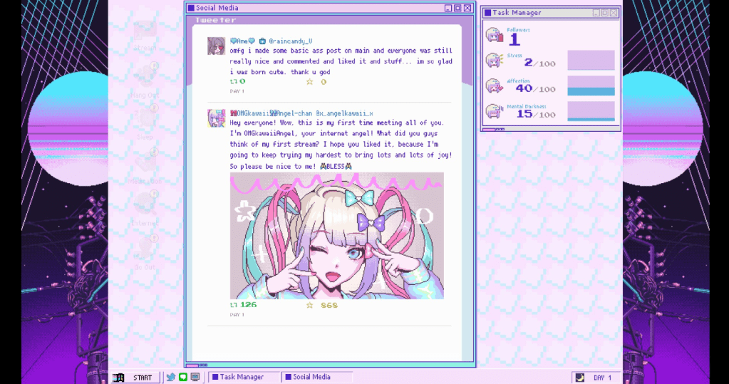 Pero sin duda lo más difícil del juego será lograr el equilibrio entre todos los aspectos de la vida de Ame/Kangel. Así, si hacemos stream de un mismo tema de forma continuada, ganaremos seguidores más rápido, pero también nos excederemos y conseguiremos un final malo. El juego cuenta con múltiples finales, tanto que nos llevará bastante tiempo sacarlos absolutamente todos. Algunos de ellos son realmente turbios, tanto que recomendamos a nuestros lectores informarse debidamente sobre todos los trigger warnings si deciden darle una oportunidad al juego. Si queremos conseguir alguno de los finales buenos (por decirlo de alguna forma), deberemos mantener la balanza entre los diferentes aspectos de la vida de Ame, además de, por supuesto, conseguir el objetivo del millón de suscriptores. Para ello, debemos conseguir el balance entre el amor que le profesamos a Ame (recordemos que nuestro personaje es su pareja), su salud mental (para ello, podemos ir al hospital), etcétera.