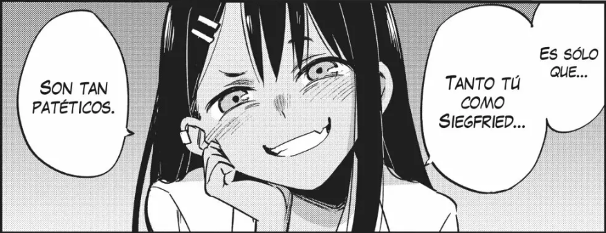 Esto desemboca en una escena en la que todas se ponen a leer su creación mientras se ríen tanto de su obra como de él mismo. Todo para luego perder el interés e irse en cuanto reciben un mensaje de otra amiga que no se encuentra con ellas, todas menos Nagatoro. Tras una pequeña conversación todo culmina con el personaje principal llorando tras haber sido llamado patético y desagradable. Estos adjetivos se utilizan más veces durante el manga, pero el contexto y la presentación importan. Mientras que en los demás momentos se expresan desde un tono distendido y cómico, aquí llevan una crueldad que desaparece tras este primer capítulo. Parece un resto del webmanga original del personaje de Nagatoro, creado por Nanashi seis años antes y con una mala baba mucho mayor a la de cualquier cosa que se muestre en este primer capítulo. Tirando más por la fantasía masoquista que el romance puro y duro. No es así en el manga ya publicado, donde Nanashi recondujo la historia por otros derroteros donde hace una mayor mezcla de comedia y romance.