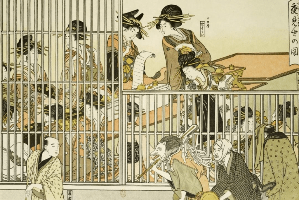 Otro cambio que se produjo durante el periodo Edo fue la adopción del confucianismo como filosofía de gobierno. Esto provoca que, en las familias, estuviera mal visto cualquier tipo de afecto, ya fuera entre cónyuges o entre padres e hijes. Así, el matrimonio es solo visto como una forma de generar descendencia y así perdurar el linaje familiar, desprovisto de todo afecto. Por tanto, si querías un vínculo romántico, debías buscarlo fuera. Esto es en el caso de los hombres, puesto que las mujeres que cometían adulterio eran castigadas con la pena de muerte. De este modo, aparecieron barrios de placer en las principales ciudades del país, donde los hombres iban a satisfacer sus necesidades románticas y sexoafectivas. Estos barrios fueron impulsados por el propio gobierno, ya que eran una forma de reunir a los hombres que quisieran realizar estas actividades y tenerlos controlados dentro de un espacio limitado, resultando así más fácil mantener el orden. Los clientes principales eran la clase comerciante y los samuráis, pues eran los que normalmente podían pagar estos servicios. Las personas que ofrecían sus servicios en estos sectores no eran solo mujeres, sino que también había hombres. Si los hombres optaban por ir a por mujeres, esto se conocía como nyodō o «vía del amor femenino». Si, en cambio, elegían a un hombre —podía tratarse de trabajadores propios de estos barrios o incluso actores jóvenes de kabuki, que también se prostituían hasta que se prohibiera su participación en obras teatrales de este género—, este camino se conoce como wakashudō o simplemente shudō, «la vía del amor a adolescentes«. Hay que apuntar, no obstante, que había hombres que podían tener amoríos tanto con las mujeres como con hombres. Con respecto a relaciones homosexuales entre mujeres, Carlos Rubio explica lo siguiente en el prefacio a la obra de El gran espejo del amor entre hombres: ‘La homosexualidad masculina japonesa tiene una historia larga y bien documentada, cualidades que, por desgracia, le faltan a la femenina, debido, en gran parte, a que en Japón, como en muchos otros países, la sexualidad era tradicionalmente expresada desde una perspectiva masculina’.