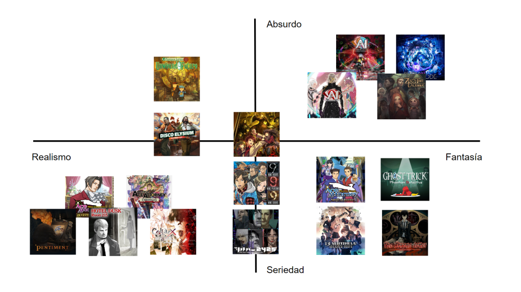 En la gráfica mostrada arriba, podéis ver una aproximación a esta idea donde, a más nos desplacemos a la derecha, más se sacrificará el realismo de la obra en favor de lo sobrenatural y viceversa. Si bien el cribado realizado no es el más exhaustivo del mundo, una primera conclusión que podemos sacar es que los títulos de misterio occidentales tienden a manejar elementos analógicos, mientras que en Japón generalmente prevalece la narrativa fantástica. Esto es consecuente con algunas de las averiguaciones sobre escapismo o desconexión que realizó nuestra compañera Leiachansan, salvando las distancias, respecto de géneros como el isekai. Asimismo, es posible afirmar que existe una ligera coincidencia entre juegos realistas y serios, así como fantásticos y absurdos. Es decir, que la preferencia por una técnica u otra conduce naturalmente a que el argumento se desarrolle de forma diferente. Cabría destacar que la ubicación de cada juego en la tabla no es óbice para que tenga segmentos tendentes a la seriedad o el absurdo, pues toda buena narrativa pegará brincos de este tipo para lograr que el jugador sienta una cosa u otra en un momento dado. Por dar un ejemplo, pese a que Kotaro Uchikoshi tiene una clara predilección por las historias tontorronas, que le caiga un rayo al autor de este artículo si no lloró un mar de lágrimas con el final del primer AI: The Somnium Files. Lo que queremos ilustrar es la tónica generalizada de la obra y de los métodos empleados por los personajes para resolver o explicar la lógica del misterio de turno.