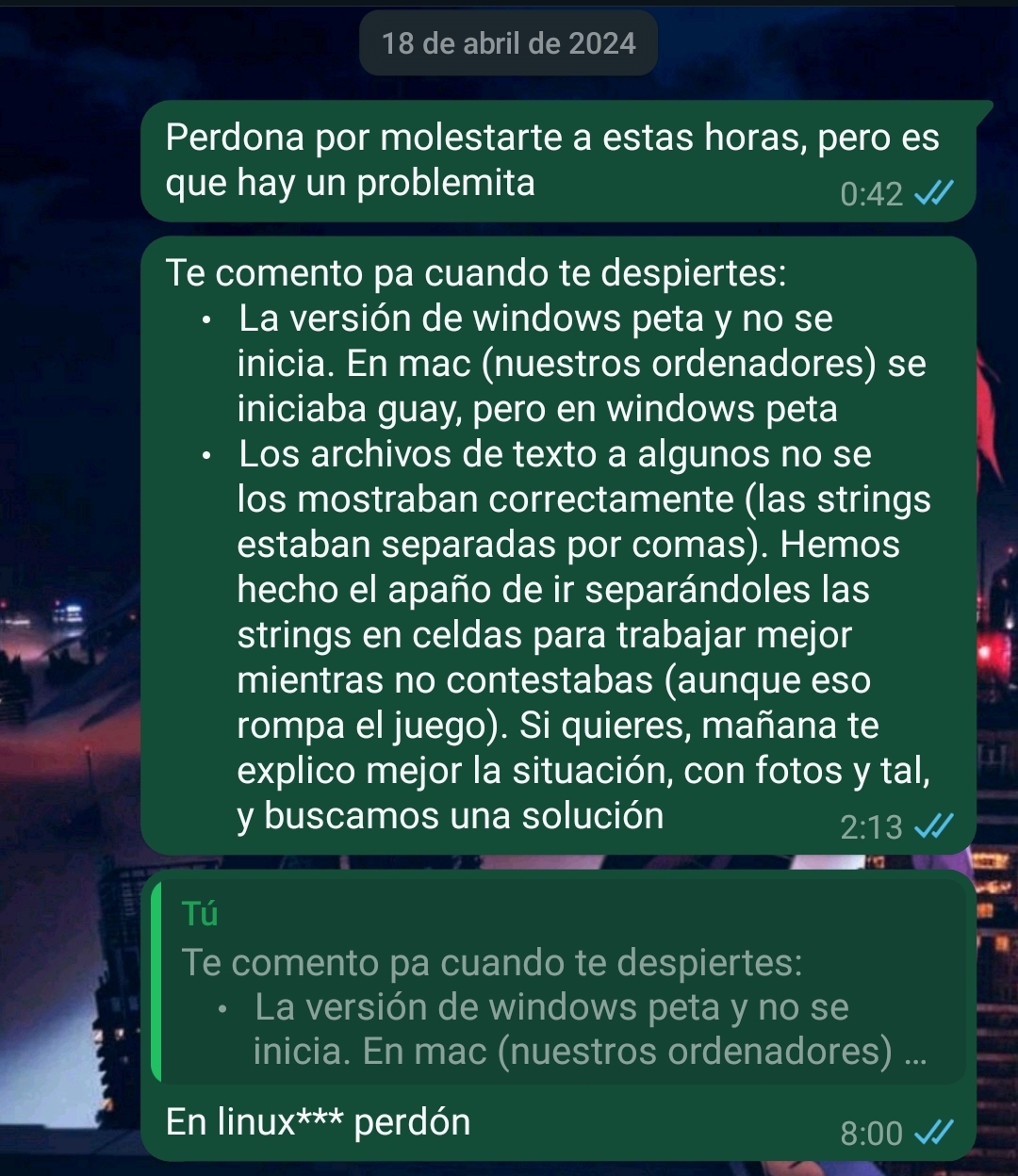 Pues bien, esos mensajes llegaron igualmente. Con una actualización de los archivos en el cual se simplificaba aún más el juego, hubo un problema con el carácter que se usaba para separar las strings de inglés y otros idiomas, por lo que en todos los documentos se mostraban juntos. Además, con esta nueva actualización el videojuego no se ejecutaba en ningún equipo, sin importar que se tratase de Windows o iOS. Por lo tanto, hasta que el desarrollador estuviese disponible por la mañana para proporcionar una solución, el equipo organizador estuvo «limpiando» todas las strings de todos los documentos de texto del juego y sugirió a los participantes que, para poder irse familiarizando con el juego, viesen algún gameplay disponible en YouTube del mismo. De esta forma, los equipos podrían ir trabajando durante el día hasta tener la solución del desarrollador y los daños se vieron minimizados —a costa de dos horas y media de sueño del equipo organizador, que al día siguiente iniciaba oficialmente el evento—.