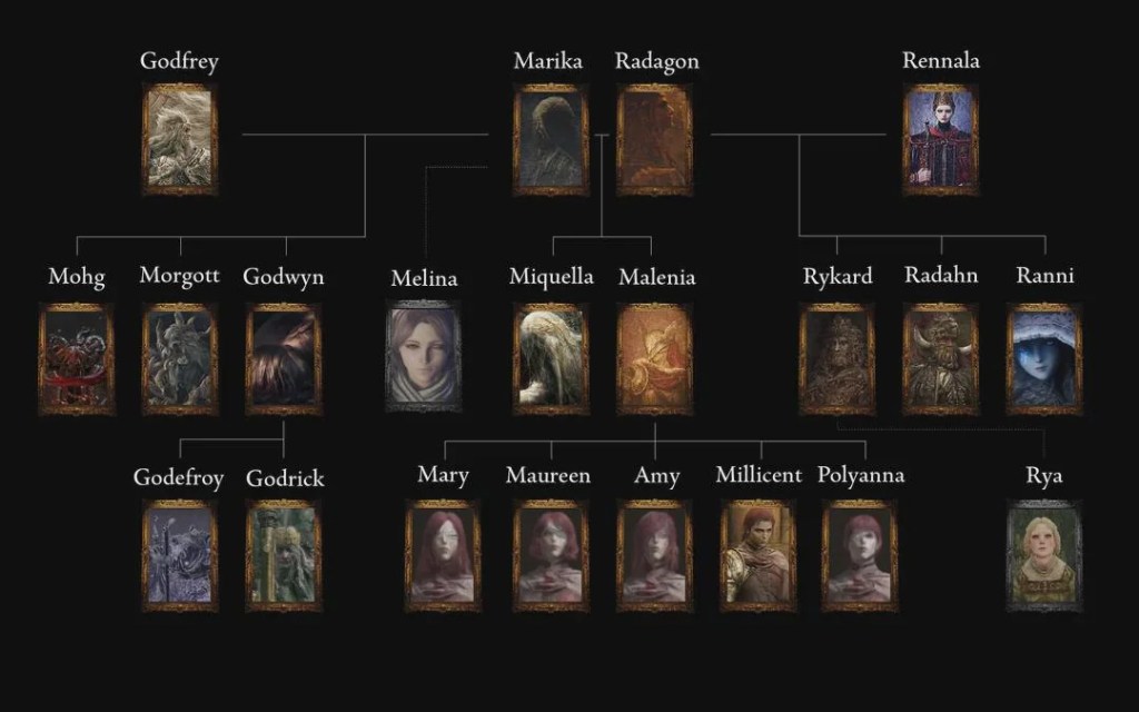 Sobre la descendencia de Marika, sabemos que de su amorío con Godfrey nació Godwyn, así como los augurios Mohg y Morgott. Es posible, pues, que tanto los Numen como los Cornamentados pertenezcan a la misma especie. Esto no es algo en lo que el juego profundice en ningún momento, solo queda especular que es el otro camino encontrado por el crisol. De su unión como Radagon con Rennala tuvo a Ranni, Radhan y a Rykard. Y, finalmente, de la unión de sus dos voluntades nacieron Malenia y Miquella.