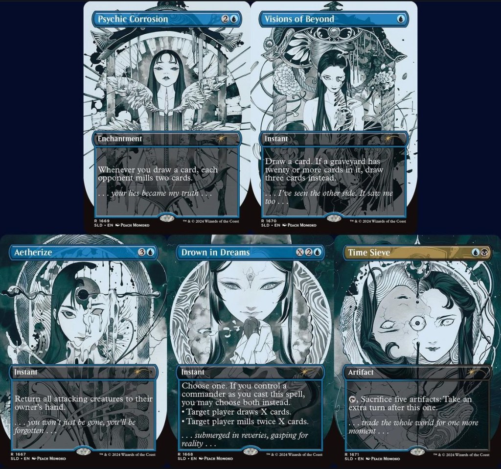 Las tierras —cartas básicas del juego que sirven para generar recursos— de Destinos de Neón contaron con una versión especial de arte de carta completa —o full art, como se las suele llamar—, con un estilo ukiyo-e genuinamente bonito de la mano de los artistas japoneses habituales con los que trabaja Wizards. Una gran cantidad de autores invitados han participado en las versiones alternativas de muchas cartas, desde comunes hasta planeswalkes legendarios. Ilustradoes de WIXOSS, Shadowverse, Duel Masters, Cardfight!! Vanguard, Rage of Bahamut, Lord of Vermillion y una infinidad de juegos de cartas. Y, aunque sean de cierto nicho en Occidente, son lo suficientemente interesantes como para llamar la atención del público nipón. Además, para los que no hemos tenido la ocasión de conocer la obra de tanto artista freelance japonés, podemos disfrutar lo que, a nuestro juicio, son la joya de la corona que es esta serie de colaboraciones: Tetsuo Hara (Hokuto no Ken), Yoji Shinkawa (Metal Gear Solid) y Terada Katsuya (Blood: The Last Vampire). Si tenéis interés por conocer en profundidad esta colaboración, os invitamos a leer el artículo sobre ello de WriteGeek, donde se detalla todo lo referente a artistas japoneses que fueron invitados.