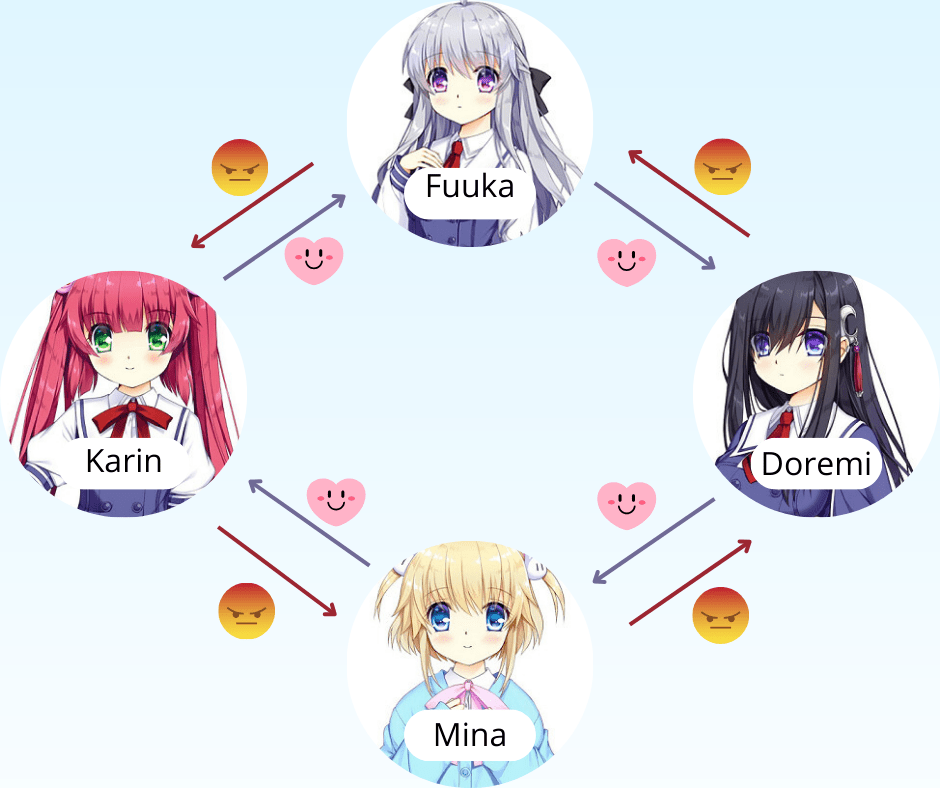Por dar algo más de contexto antes de meternos en la parte importante del asunto. Podemos hablar de que existe un cuadrilatero relacional en este juego. Cada una de ellas tiene una mejor amiga, la cual nunca coincide entre ninguna, y a la vez todas tienen a alguien a quien odian más que a nadie en este mundo —para una información más visual echadle un vistazo al esquema debajo de este párrafo. Eso llevará a que al menos alguna de ellas no esté nunca contenta con la decisión de a quién sacrificar y por ello las otras, o ellas mismas, destaparán sus odios más ocultos para conseguir salirse con la suya. Una escena típica funciona de esta manera: Chica 1 será encadenada a la silla de tortura e intenta apelar a los sentimientos de Chica 2 porque es su mejor amiga. Chica 2 se reirá de manera maniática porque en verdad siempre ha odiado a Chica 1 y cree que se merece morir por ello. Chica 3 estará muy en desacuerdo y muy triste porque su mejor amiga es Chica 1 y no quiere verla morir. Chica 4 es manipulada o no por Chica 2 para dejar morir a Chica 1, o cambiarán roles dependiendo de quién sea la otra posible culpable. Tras eso a veces salen o a veces mueren todas, pero nunca sabremos más de su paradero.