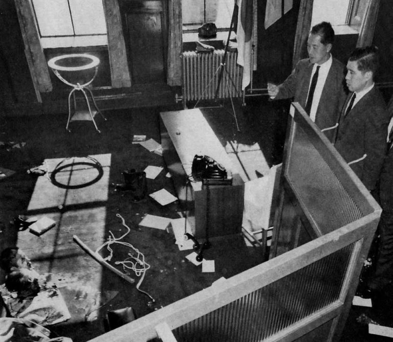 Esto nos lleva finalmente a la mañana del 25 de noviembre de 1970, momento en el que Mishima viajó en coche junto con cuatro colaboradores del Tatenokai—Masakatsu Morita, Hiroyasu Koga, Masayoshi Koga y Masahiro Ogawa—, hasta el Campamento Ichigaya, cuartel general del Comando Oriental del Jietai. Una vez allí, pidió reunirse en privado con el general Katenoshi Mashita, máxima autoridad de las instalaciones, con la excusa de enseñarle una inusual katana del siglo XVII propiedad de Mishima. Una vez el interior, él y sus seguidores secuestraron al general, atándolo de pies y manos a su silla y exigiendo que todos los soldados del cuartel —aproximadamente unos mil— se reunieran enfrente del balcón del edificio para escuchar un discurso. De lo contrario, ejecutarían al general. Los militares, desconcertados por la situación, intentaron entrar en varias ocasiones al despacho donde tenían secuestrado al general, pero fueron recibidos por Mishima, quien, katana en mano, hirió gravemente a siete de ellos.