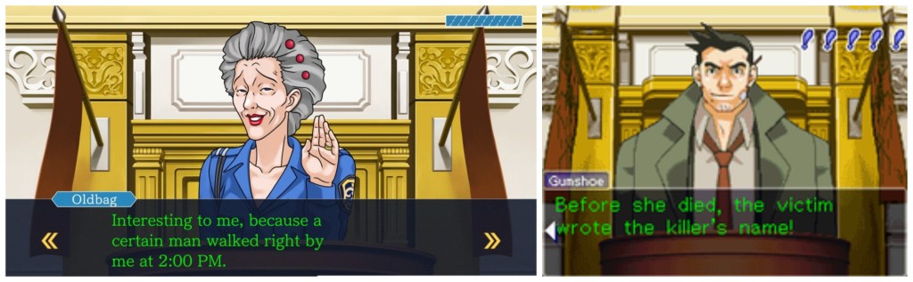 Durante el caso se utiliza no solo la falta de experiencia de Phoenix, sino también sus nervios como excusa para implementar de manera diegética el tutorial, cosa que se volverá más tarde una tradición en la saga, con éxito variable —el caso de Justice for All es muy debatido, por ejemplo—. Las mecánicas son inicialmente muy sencillas, pues el testigo —solo tenemos uno en este caso— hará unas declaraciones, las cuales podremos presionar para activar un diálogo específico hasta encontrar una contradicción. Si presentamos la prueba que demuestre esta falla en su lógica, la música se detendrá para advertirnos de nuestro éxito y, si no, iremos perdiendo puntos —un trozo de una barra o una exclamación, según la versión— hasta perder la partida.