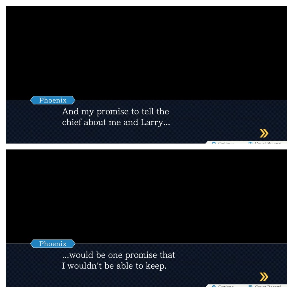 Lo interesante de verdad ocurre tras el juicio como tal, cuando se nos aparece un melancólico Larry que, pese a haber sido declarado como inocente, está muy triste debido a que su relación con Cindy no era recíproca. A modo de recomponerse, decide regalarle un reloj idéntico al arma del crimen a Mia, momento en el que se nos revela que aquel también fue un obsequio de Larry para Cindy —que todavía lo conservase, pese a su distancia, es algo que le conmovió—. Después, Mia felicita a Phoenix y como celebración decide invitarle a comer, pero le insiste en que le debe contar por qué se hizo abogado y cómo encaja todo eso con Larry. Sin embargo, el jugador no descubre aún el motivo y unas palabras ominosas de Phoenix al final dan a entender que algo malo va a pasar. Todo esto nos deja con ganas de saber lo siguiente.