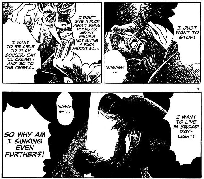 Otro gran problema que se une es la indiferencia de las instituciones. Profesores que prefieren mirar hacia otro lado, policía que antepone el castigo a otras medidas y agravan el problema, centros de rehabilitación que no hacen un buen seguimiento de los pacientes, cómo se prioriza la voluntad de los padres a la seguridad de sus hijos y un largo etcétera. Mizutani quiere hacer entender que culpabilizar a las víctimas de sus problemas sólo agrava sus situaciones y los hunde aún más en la oscuridad, aislándolos, y en muchas ocasiones debe actuar a los márgenes de la ley para poder protegerlos. La crítica implícita a cómo la ley japonesa no protege a los menores y jóvenes está presente en toda la obra.