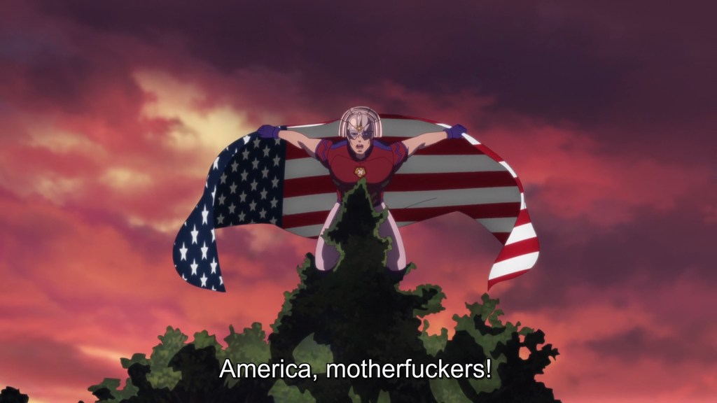 Si debemos empezar por algún lado, sería por el susodicho Escuadrón Suicida. Del gran elenco de personajes que puedes escoger entre los supervillanos de DC, no eligieron mal. Tienes a caras muy reconocidas dentro de este repertorio: Harley Quinn, Killshot, Cara de Barro, Rey Tiburón y El Pacificador. Sin embargo, el uso de estos personajes durante estos 10 episodios es vacío y reaccionario. Harley Quinn es quién llevará la voz cantante pero su desarrollo se basa únicamente en conocer personas en este mundo, sin llevarla a ninguna clase de arco de personaje. Cara de Barro aporta el alivio cómico, pero su repertorio de chistes son simples metacomentarios sobre el concepto de los isekai y el encontrarse en otros mundos. Efectivamente, este humor envejece demasiado rápido. Para rematar, Rey Tiburón y El Pacificador directamente son relegados a un segundo plano, es decir, están ahí para rellenar escenas de combate y para encabezar alguna ocurrencia ocasional. Pueden ser graciosos en alguna que otra ocasión, pero podrías borrarlos de la ecuación que es esta serie y no pasaría absolutamente nada. De hecho, El Pacificador parece estar presente solo para justificar soluciones rápidas a conflictos banales y es una pena, pues este personaje puede dar mucho juego a cualquier historia en la que esté, hecho que se ha probado con otras obras en las que aparece.