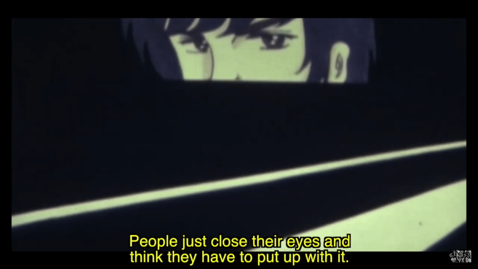 Documentales reales, vídeos reales, y también espacios y paisajes reales, todo en medio de la animación o uniéndose con ella. Paisajes naturales contaminados, espacios vacíos, calles llenas de gente simplemente pasando de largo. ¿Qué pueden revelar estas imágenes? Masao Matsuda hablaba de la idea de la Teoría del paisaje, después desarrollada en el cine de Masao Adachi, en la cual se expone que el paisaje que se estaba construyendo tras la posguerra con la aceleración del capitalismo resultaba ser represivo y alienante para las personas. Harada quería mostrar que la marginalidad o la competitividad es estructural y tiene raíz también un el entorno social que asfixia a los ciudadanos.