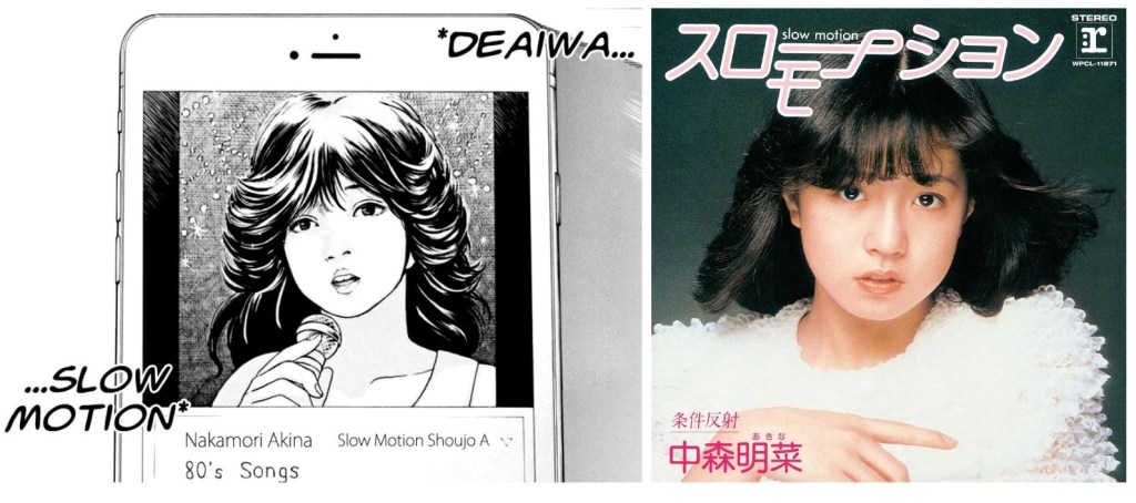 Y si bien es bonito disfrutar de dos jóvenes enamorándose y ganando confianza a través de sus aficiones, el manga también te hace interesarte más por el encanto que pueden guardar estas. Su título hace referencia a la canción Slow Motion de Akina Nakamori y casi cada título de los capítulos hace referencia a una nueva canción, invitando a ponerle banda sonora a tu lectura, así como el arte del dibujo rememora el estilo de la década y cada detallito te enseña algo nuevo. Incluso los nombres de los protagonistas hacen referencia a dos artistas: Ootaki Eiikichi y Hiroko Yakushimaru.