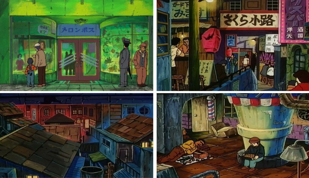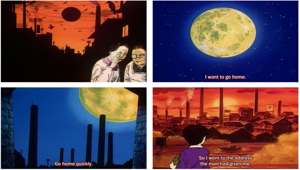 A modo de refuerzo visual del ambiente misterioso e ilusionista de la historia vemos dos elementos: las chimeneas y la luna. La luna —sobre cuyos simbolismos ya os hemos hablado en esta web— representa tradicionalmente en artes como el teatro Noh y Kabuki las escenas más místicas y la frontera entre el mundo de los vivos y los espíritus, además del color rojo que imprime el presagio de que algo malo puede ocurrir. Las chimeneas hacen referencia a las obake entotsu —chimeneas encantadas— representadas en la película Entotsu no Mieru Basho (1953), llamadas así porque el número de chimeneas visibles cambia dependiendo desde dónde las mires.