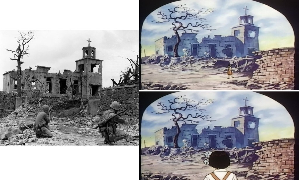 Durante la escena final, quizás la más confusa para la audiencia, hay un elemento muy curioso que se suele pasar por alto: el edificio destruido. Midori vaga por las calles y encuentra el mismo escenario críptico repetido de escenas que siempre concluyen en ese edificio. La construcción en cuestión es la Iglesia de Shuri en Okinawa, que fue destruida durante la Segunda Guerra Mundial, y el dibujo que se muestra está directamente basado en una fotografía de los soldados americanos durante la guerra.