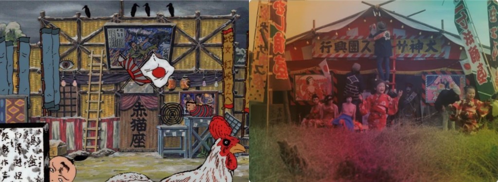 La inspiración en las películas de Shuji Terayama es palpable, especialmente de Pastoral, y hay que destacar cómo la troupe teatral de Terayama tuvo como lema “restaurar la popularidad del misemono”, como se puede ver a través de la puesta en escena de sus producciones, muy relacionada con esos espectáculos. Midori es una niña que, debido a su pobreza, acaba siendo explotada en un freak show. Más allá de los detalles más turbios de su experiencia, que ya casi todos conocen, la historia original contiene una gran simbología visual, que en la adaptación de anime se extendería en sus escenarios al terreno más político.
