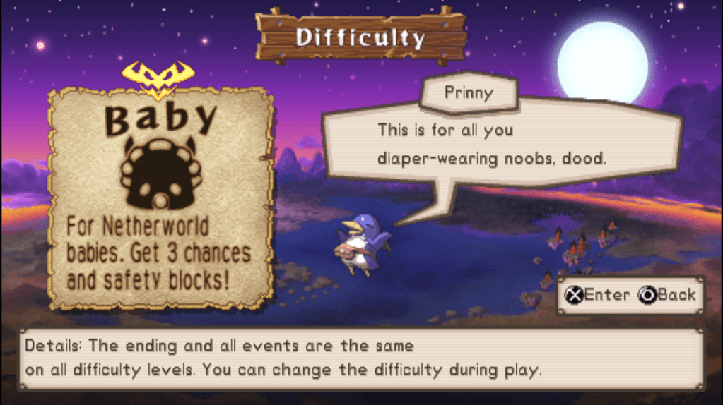 Desde los primeros Wolfenstein, en los que la dificultad más fácil vestía a Blazkowicz de bebé, muchísimos desarrolladores han usado el modo fácil para reírse de los jugadores que optaban por dificultades más sencillas en sus títulos. Si bien es cierto que este tipo de contenidos copan los vídeos de YouTube que buscan generar visitas fáciles, hay algunos casos interesantes a comentar, como el de Metal Gear Solid V, donde Big Boss tendrá la opción de equiparse un gorro de gallina si falla varias veces una misión, lo cual hará —por algún motivo que no termina de quedar claro— que a los enemigos les cueste más detectarlo. El efecto podría ser el mismo con cualquier otro objeto —como la bandana de munición infinita del primer Metal Gear Solid—, pero en esta ocasión Hideo Kojima optó por la burla y el desdén. Prinny 2: Dawn of Operation Panties, Dood!, la segunda entrega del spin-off de plataformas de Disgaea, hace uso de una —más que necesaria— opción de modo fácil, no sin antes llamar de nuevo bebés a los jugadores que quieren usar esta dificultad. Parece ser que querer jugar tranquilo —y, en ocasiones, no sufrir por las malas decisiones de diseño de un equipo de desarrollo— es sinónimo de ser un bebé, con todo lo que ello implica.