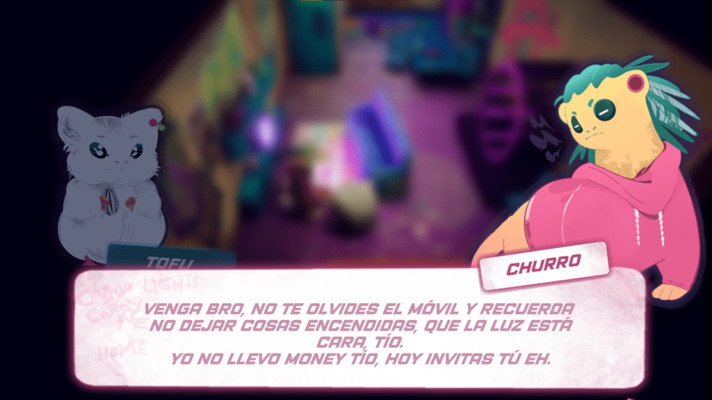 Pero no podíamos irnos sin probar antes el juego del hámster monísimo. Un pequeño roedor llamado Tofu, que habita en Furrol junto con su colega, el Churro. Son unos macarrillas que solo quieren salir de fiesta y emborracharse, así que te tocará encontrar a tu colega, que se le ha perdido de fiesta, el muy truhan.