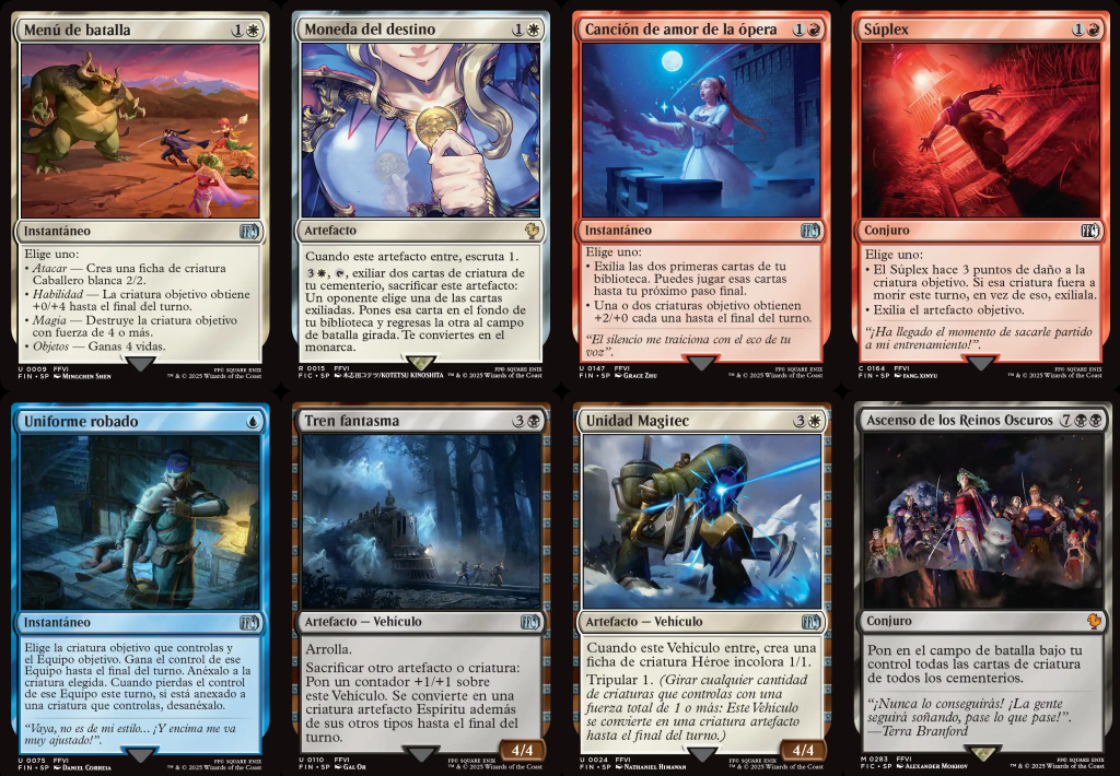 Final Fantasy VI está ampliamente considerado como una de las mejores entradas de la longeva franquicia, compitiendo normalmente entre los fans junto a la séptima y novena entrega por ser la mejor. Y este favoritismo se nota también en el set, ya que la entrega de Terra y compañía es una de las que ha recibido mayor representación. En esta ocasión hay tantísimas cartas más allá de los propios personajes —además de un mazo entero preconstruido de formato Commander— que, fuera de los protagonistas, hay una gran cantidad de ellas que merecen ser mencionadas. La primera de todas, siguiendo el orden en que se muestra en la web oficial, es Menú de batalla, que permitirá a su jugador elegir cuál de las opciones queremos aplicar: Atacar, Habilidad, Magia u Objetos, siendo cada una de esta opciones las disponibles en el juego en el propio menú de batalla. La moneda de doble cara de Edgar no podía faltar como un artefacto: Moneda del destino es el elemento protagonista de una de las escenas más emotivas del juego. Con esta podremos elegir a dos criaturas, una de las cuales quedará exiliada y la otra volverá al campo de batalla, convirtiendo a su controlador en el monarca. El paralelismo de esta mecánica con la historia de Edgar y Sabin es, simplemente, espectacular. Hay una carta también de la escena en que Locke tiene que hacerse con un uniforme de un guardia, Uniforme robado, y, aunque no es la más interesante en lo que a este artículo se refiere, es extremadamente poderosa y verá juego en gran cantidad de formatos, especialmente siendo infrecuente y con la cantidad de equipos que se van a ver en este set.