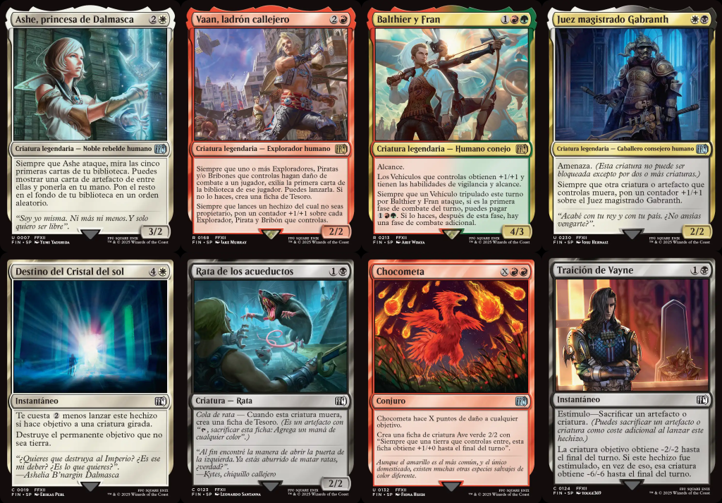 Consideraciones e hipótesis aparte, la selección para este juego es relativamente escasa y no tiene una fantasía que cuadre totalmente con sus encarnación en el videojuego. Comenzando con los conjuros e instantáneos, está el Chocometa, en referencia al infame chocobo rojo que podía aparecer con unas posibilidades bajísimas en ciertas circunstancias. Este enemigo podía realizar el ataque homónimo, capaz de aniquilar a todo el grupo. Para representar eso, el jugador de esta carta puede pagar cualquier cantidad de maná para hacer esa misma cantidad de daño, convirtiéndolo en un conjuro mortal de necesidad. Por su lado, en lugar de tener una carta de criatura de Vayne, el villano del juego, WotC ha decidido convertirlo en un instantáneo llamado Traición de Vayne. Este hechizo permite a su lanzador otorgar -2/-2 —o -6/-6 si sacrifica algo a cambio— a una criatura, pudiendo llegar a matarla ignorando la propiedad indestructible, algo que puede llegar a verse como la forma que usa Vayne de acabar con el anterior emperador de Arcadia, que estaba protegido por sus guardias personales.
