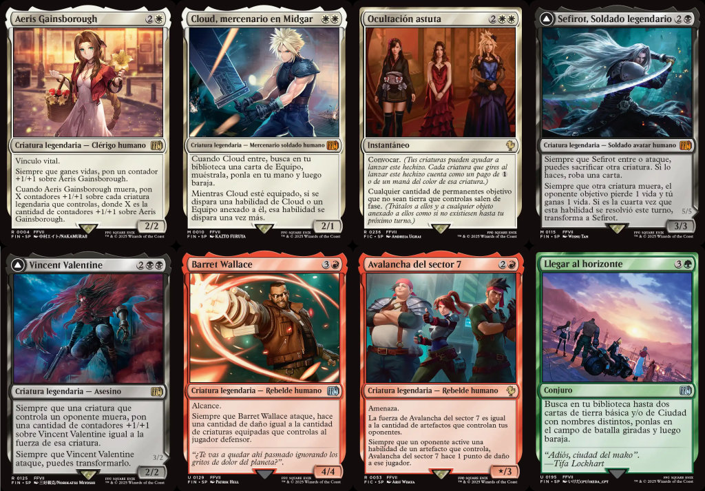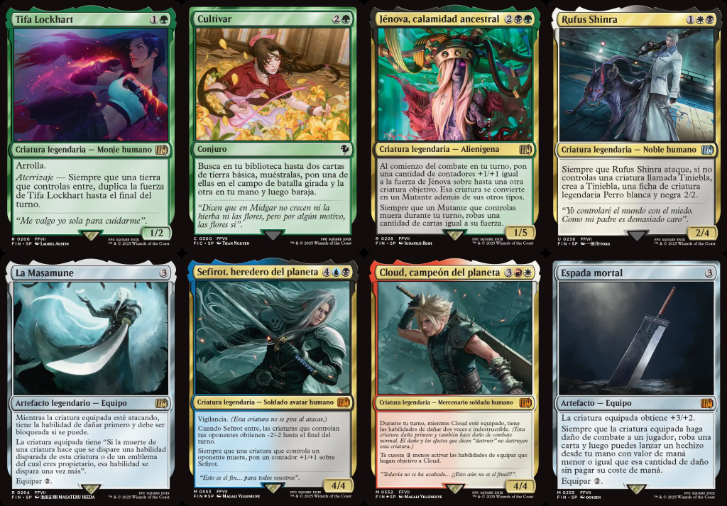 Ha sido difícil escoger solo un puñado de las que hablar debido a la cantidad y calidad de las mismas, pero Aeris Gainsborough es un punto de comienzo tan bueno como cualquier otro. Igual que muchos otros sanadores del set, Aeris cuenta con vínculo vital, que convierte su daño en curación y se fortalece cada vez que se recupera vida de cualquier forma. En el momento en que —¿spoiler?— Aeris Gainsborough muera, repartirá toda esa fuerza adicional entre el resto de criaturas legendarias que controle su portador, o lo que es lo mismo: el resto de su grupo. La muerte de Aeris no solo hiere el corazón de sus allegados, sino que también hace que se resolución crezca. Y aunque lo ideal sería continuar con Cloud, es mejor conocer antes las habilidades de Zack Fair para poder contextualizar mejor su carta. Zack Fair es una criatura blanca que entra al juego con fuerza extra y que al morir, otorga sus contadores y uno de sus equipos a otra criatura, además de hacerla indestructible ese turno. Esta habilidad es una traducción en mecánicas de Magic a la escena de su muerte en Crisis Core: Zack muere por salvar a Cloud, haciéndolo indestructible, otorgándole su espada y su legado. Por su lado, Cloud, ahora sí, cuenta con un total de tres naipes —cuatro si se incluyen las reimpresiones de Through the Ages, que se están omitiendo en este artículo—, las cuales son Cloud, mercenario en Midgar, Cloud, ex-Soldado y Cloud, campeón del planeta. Si bien la primera y última de esta lista son mecánicamente interesantes, no reflejan especialmente la personalidad ni la historia de Cloud, algo que si hace Cloud, ex-Soldado. El tema con las cartas de Final Fantasy VII es el número 7 en muchos elementos, incluso en la cantidad de palabras que tienen —no hace falta más que echar un vistazo a Arma Artema para entender esto—. Y con Cloud, ex-Soldado como la cara visible del mazo de Commander, no podía ser de otra forma: puede atacar según entre en juego y se equipa un artefacto al entrar al campo de batalla, formando así una similitud muy bella con la habilidad de Zack de entregar su arma al morir. Además de poder robar cartas al atacar, Cloud creará dos tesoros si logra atacar con una fuerza de 7 o más, representando los pagos que recibe por ser mercenario. Y, de forma más que intencionada, si Cloud, ex-Soldado se equipa con la Espada mortal, su icónica espada, logrará llegar a los 7 puntos de fuerza requeridos para activar su habilidad.