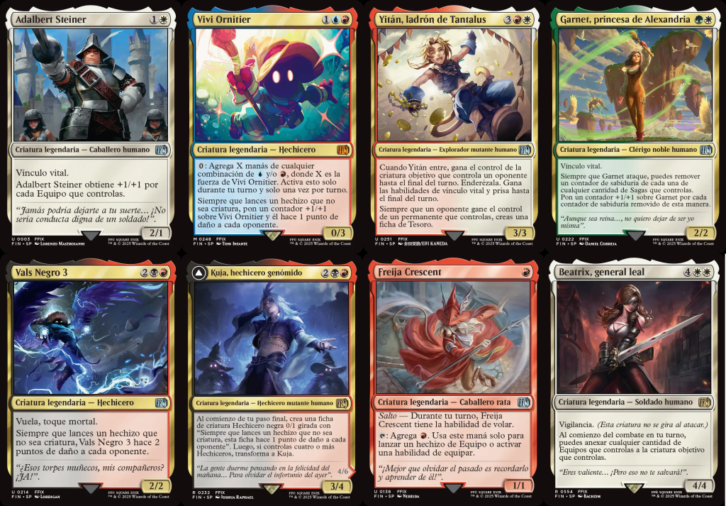 Adalbert Steiner es sencilla, eficaz y cae en el arquetipo de paladín: curar y hacerse fuerte, por lo que cuanto mayor sea el equipamiento que haya disponible para él, mejor. Si bien esto no termina de cuadrar del todo con su personaje, sí que está muy pensado para ser jugado junto a Beatrix, general leal, quien puede hacer que Steiner se convierta en una opción excepcionalmente poderosa, ya que le puede anexar automáticamente todos esos equipos de los que él se beneficia. Un combo digno de hacer que suene Something to Protect de fondo. Respecto al resto de miembros protagonistas del juego, se puede recalcar la presencia de Yitán, ladrón de Tantalus, quién se encargará de secuestrar una criatura enemiga tal y como hace con Garnet en los primeros compases del juego —algo que además también se puede ver en Solicitud inesperada—. Hablando de Garnet, su carta es una inclusión necesaria en cualquier mazo de sagas que se precie, ya que podrá quitar contadores de sabiduría de estos encantamientos, haciendo que puedan permanecer durante más tiempo en el campo de batalla, la mayor debilidad de este tipo de recursos. Por último, Freija Crescent se ha convertido en una carta extremadamente popular en ciertos mazos rojos —especialmente en mazos boros, blancos y rojos—, ya que es, en las circunstancias correctas, un Elfos de Llanowar rojo, la cual puede volar en su turno por su efecto de Salto, como el resto de draconarius del set. Elfos de Llanowar se puede girar para otorgar un maná verde a su controlador, lo cuál es, a efectos prácticos, una tierra de ventaja frente al oponente. Por eso mismo lleva siendo una opción primordial de casi cualquier mazo verde y tener un equivalente en rojo, aunque algo más limitado, es algo que puede dar pie a composiciones de mazo muy interesantes.