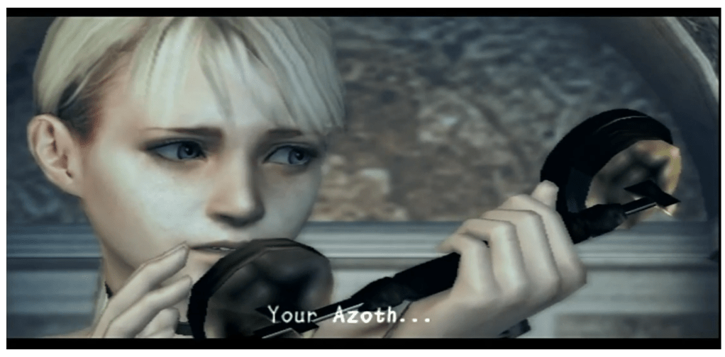 El azoth es un concepto de la alquimia tradicional relacionado con el mercurio filosófico y la esencia vital. Se creía que era el agente esencial de la transformación y algunas tradiciones místicas lo consideraban una metáfora para alcanzar un estado de conciencia superior. En Haunting Ground, este elemento está representado con mucha ambigüedad. Todos los seres vivos parecen tener un poquito de azoth, así que lo podemos considerar una especie de fuerza vital o la esencia de la vida, algo muy preciado por los villanos principales del juego para conseguir la ansiada inmortalidad.